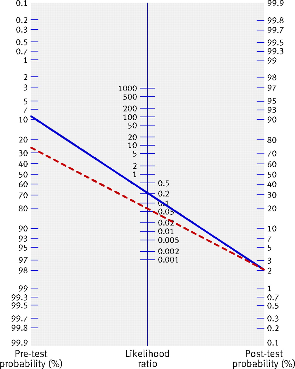 A esta altura, alguns devem questionar como calculei a probabilidade pós-teste em todos estes exemplos. Hoje usei o aplicativo do Iphone (há muitos), onde coloco apenas a probabilidade pré-teste do paciente e a RP do método. Mas tradicionalmente isto é feito pelo Nomograma de Fagan (foto acima), onde traçamos uma linha que se inicia na probabilidade pré-teste, passa pela RP e termina na probabilidade pós-teste. Façam uma simulação e vejam como é fácil. Se o teste for positivo, utilizamos a RP positiva; se for negativo, utilizamos a RP negativa.
