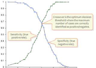 Cuidado com algo muito específico, pode ser pouco sensível. Nem sempre vale a pena trocar o equilíbrio da sensibilidade e especificidade (crossover no gráfico acima), pela priorização de alguma destas propriedades.