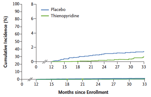 Um segundo conceito comprovado pelo estudo é da redução de eventos não relacionados a trombose do stent. Ou seja, nestes pacientes mais complexos (que necessitaram de intervenção percutânea), a manutenção do clopidogrel confere uma certa proteção (- 2%, NNT = 63) contra infarto do miocárdio não dependente de trombose do stent.