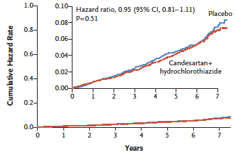 O estudo não fornece numericamente o hazard (eventos/pessoas-ano), ou seja, a probabilidade cumulativa do desfecho. Mas olhando o gráfico de sobrevida (abaixo) podemos obter a mortalidade cumulativa, traçando uma linha imaginária nos 10 anos de seguimento, que é a mediana do tempo de seguimento. Observem na linha que a probabilidade cumulativa de morte no grupo controle é 0.69 (69%). Além disso, o artigo nos traz o hazard ratio para morte geral = 0.84.